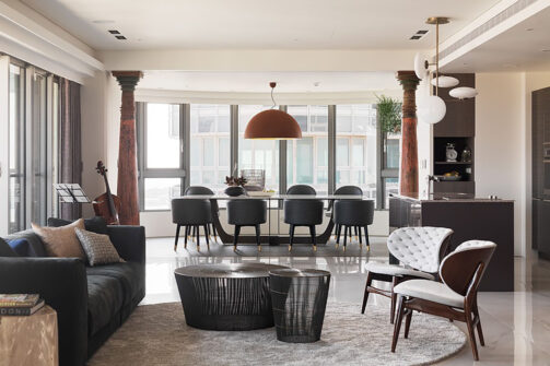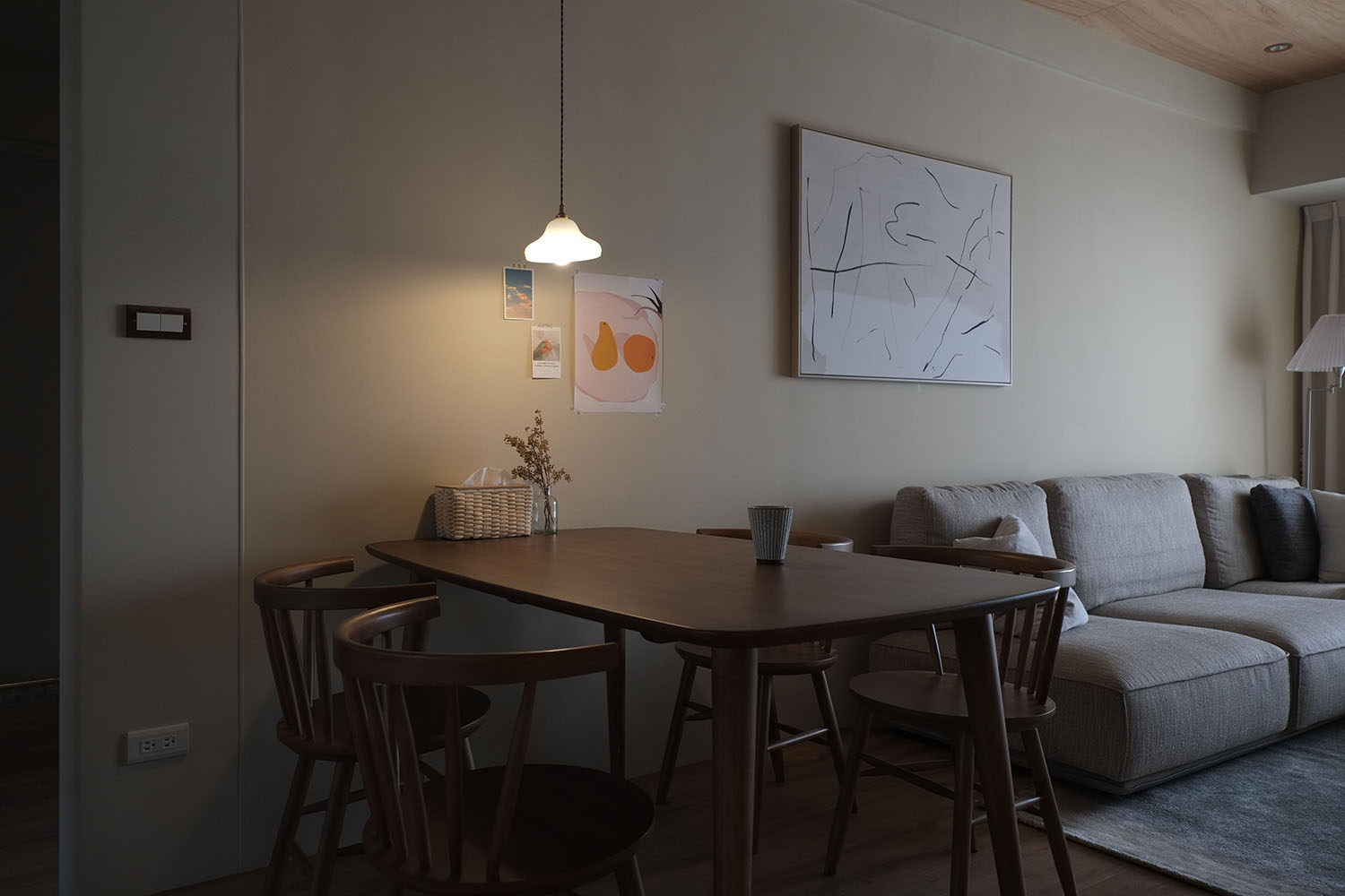 選用數件老件重新定義家的樣貌,無論是為主臥點亮出更豐富樣貌的黃銅化妝燈,或餐桌上沿自日治時期以來的白玉老玻璃吊燈,在空間氛圍的營造上刻畫出真摯的溫度,更巧妙融入了屋主絕佳的個人品味。