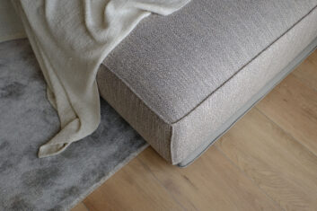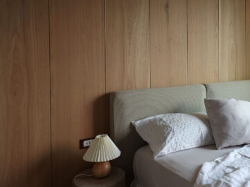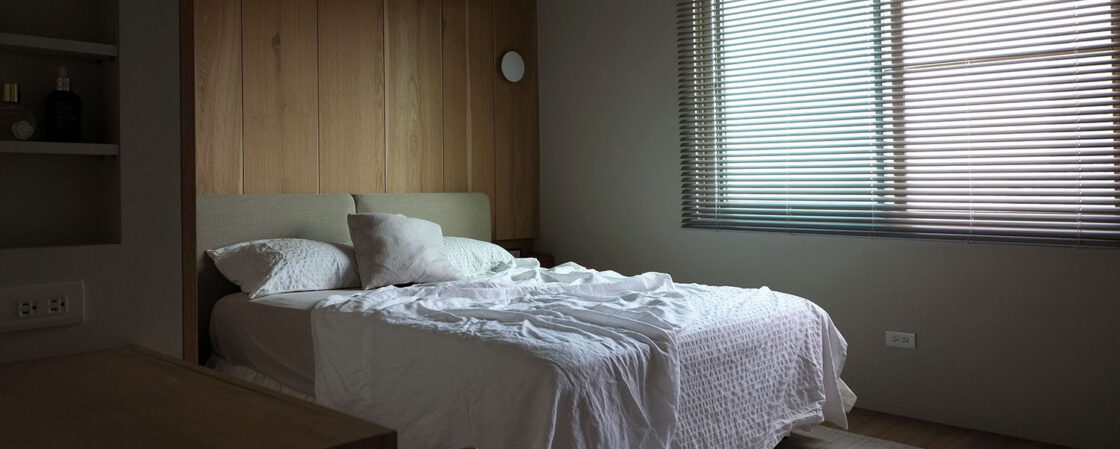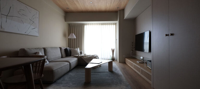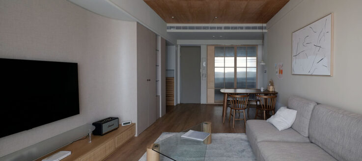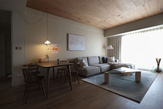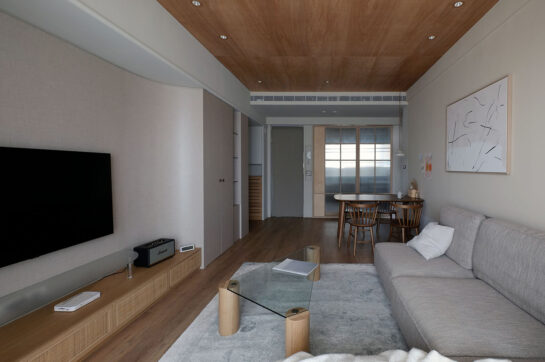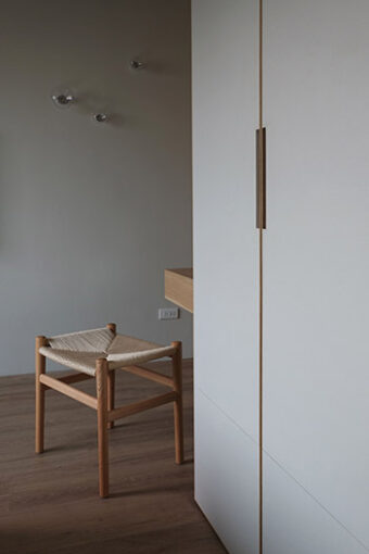 在以木質感作為基調的空間中使用不同牆面材質豐富了視覺層次,藉由大面積進口布紋美耐板讓客廳場域延伸;幾何大弧型電視牆細膩地暗示了分區的不同,不但使空間感產生流動也具功能性。主臥室床頭則以特製的白橡木皮盡情展現木紋的大氣與溫潤,與幾支深度高的大樑相互對應產生和諧結構,同時延展至衣櫃處模糊了稜角,放大空間之外亦傳達出人與自然共處的生活調性。