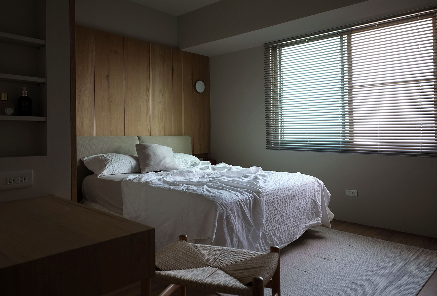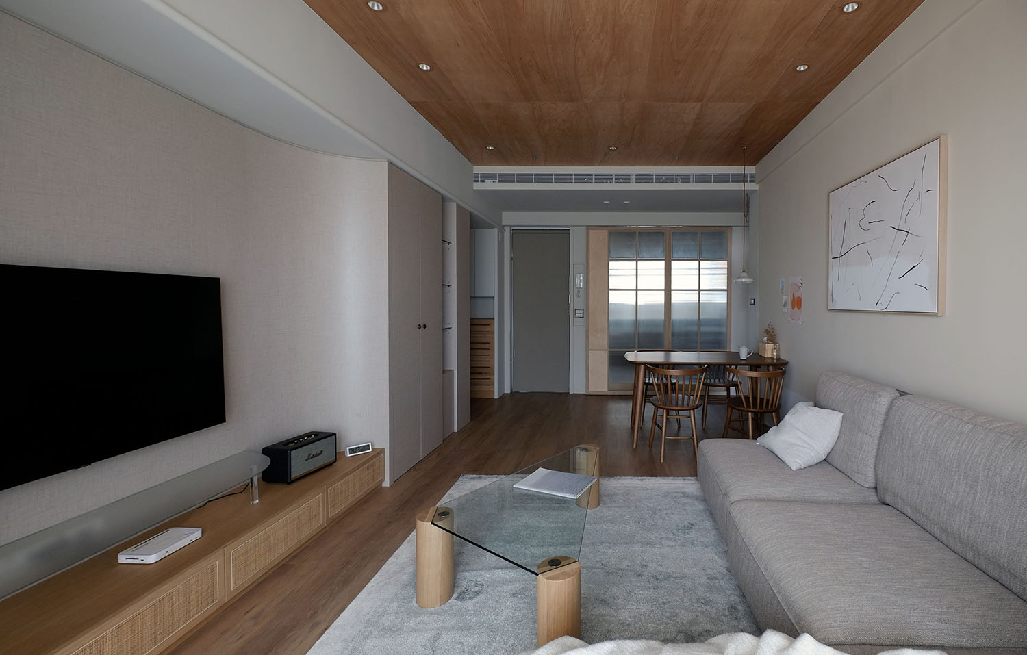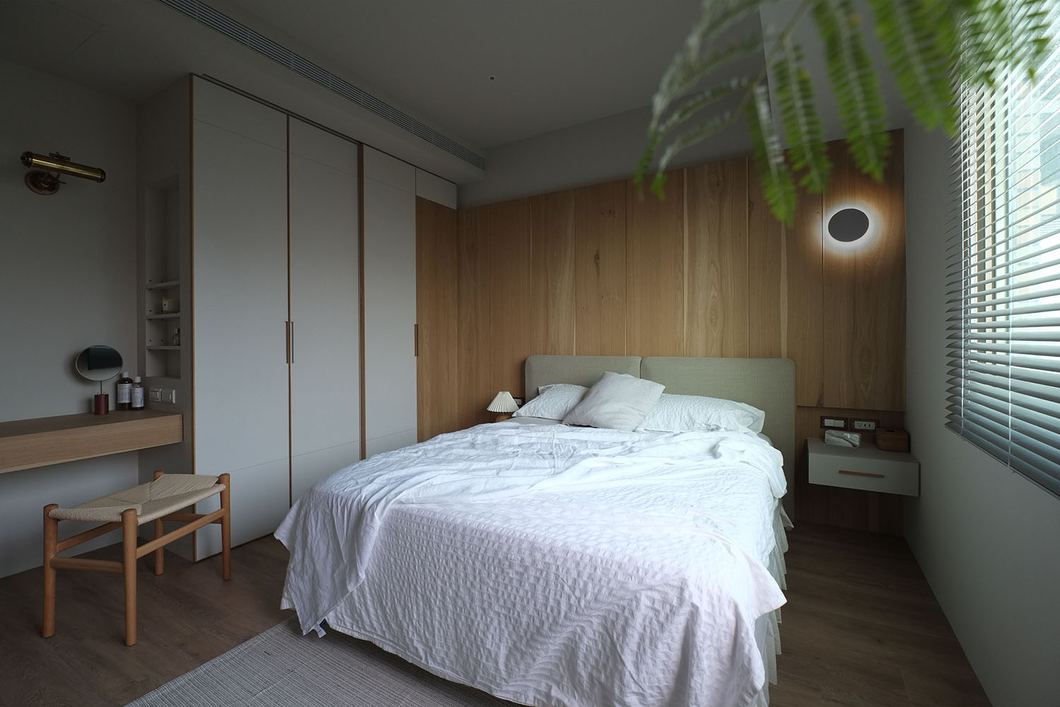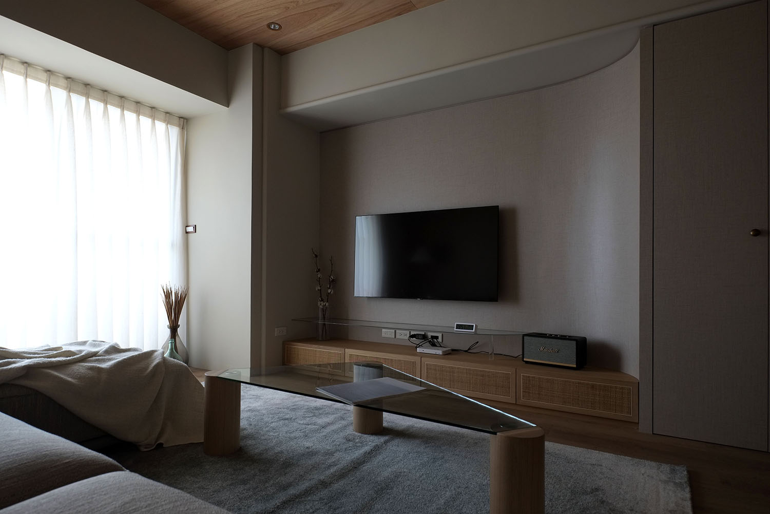 在以木質感作為基調的空間中使用不同牆面材質豐富了視覺層次,藉由大面積進口布紋美耐板讓客廳場域延伸;幾何大弧型電視牆細膩地暗示了分區的不同,不但使空間感產生流動也具功能性。主臥室床頭則以特製的白橡木皮盡情展現木紋的大氣與溫潤,與幾支深度高的大樑相互對應產生和諧結構,同時延展至衣櫃處模糊了稜角,放大空間之外亦傳達出人與自然共處的生活調性。