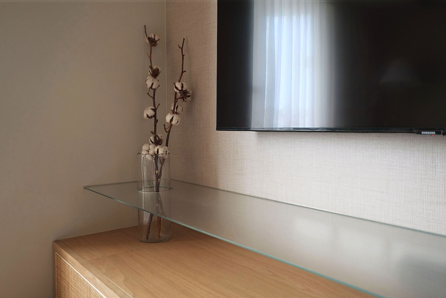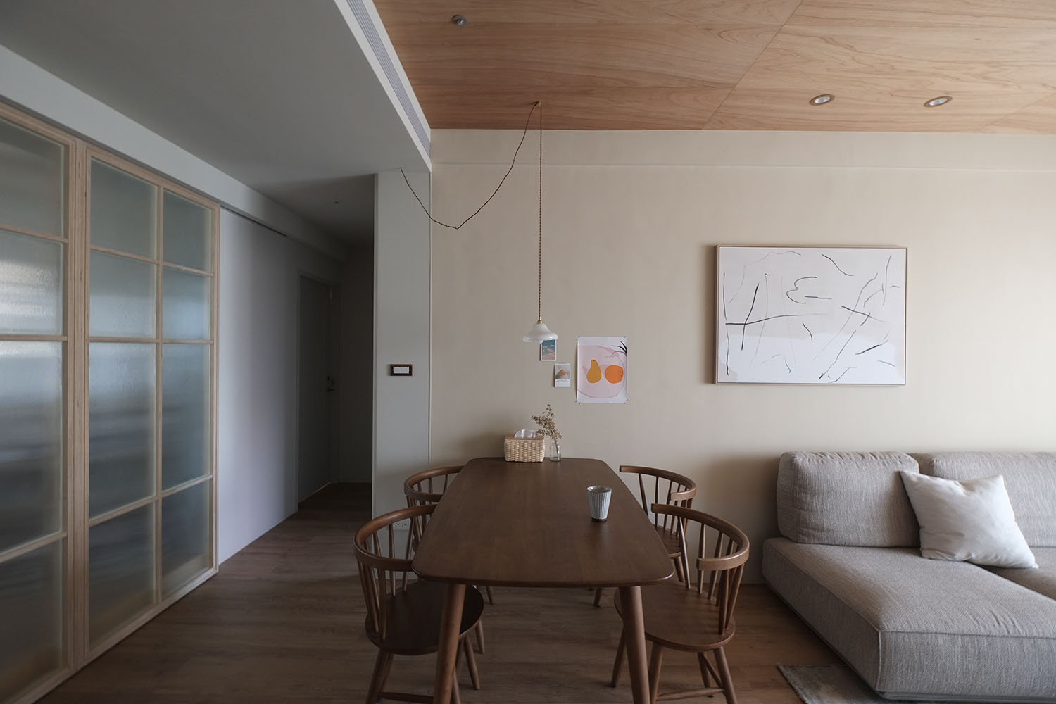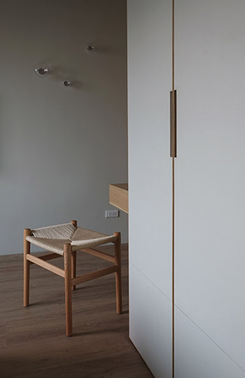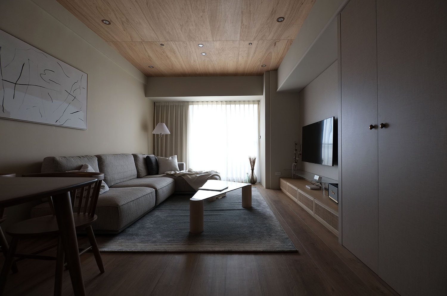 在以木質感作為基調的空間中使用不同牆面材質豐富了視覺層次,藉由大面積進口布紋美耐板讓客廳場域延伸;幾何大弧型電視牆細膩地暗示了分區的不同,不但使空間感產生流動也具功能性。主臥室床頭則以特製的白橡木皮盡情展現木紋的大氣與溫潤,與幾支深度高的大樑相互對應產生和諧結構,同時延展至衣櫃處模糊了稜角,放大空間之外亦傳達出人與自然共處的生活調性。